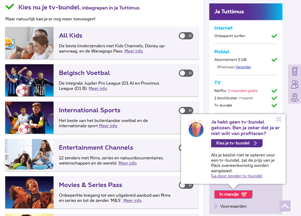 Het was de alerte community van Userbase die tot de ontdekking kwam. Wanneer je in de Pack-samensteller alle schuivertjes bij de tv-bundels uit laat staan en vervolgens op de knop ‘In mandje’ klikt om verder te gaan, krijg je een pop-up met de vraag of je al dan niet nog een gratis tv-bundel wil kiezen. Klik je op ‘Ga door zonder tv-bundel’ dan wordt een korting van 7,95 euro in rekening gebracht op je Tuttimus-pakket.