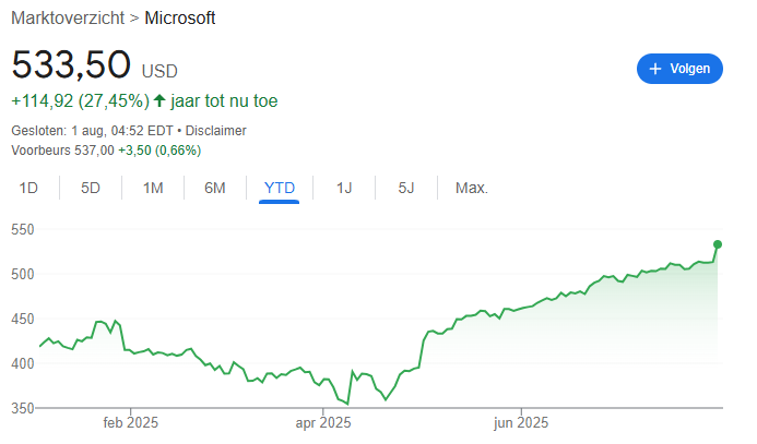 Verder is Microsoft ook al een tijdje stevig aan het herstructureren. Duizenden jobs werden al geschrapt, terwijl de investeringen in AI opgeschroefd worden. Dat zou het bedrijf efficiënter moeten maken, wat aandeelhouders natuurlijk wel kan smaken. Even werd er gevreesd dat het beleid van de Amerikaanse president Donald Trump roet in het eten zou gooien, maar dat is vooralsnog niet het geval. Microsoft laat al sinds september 2022 kwartaal na kwartaal nieuwe recordwinsten optekenen, waardoor ook de waarde van het aandeel nieuwe hoogtes blijft opzoeken.