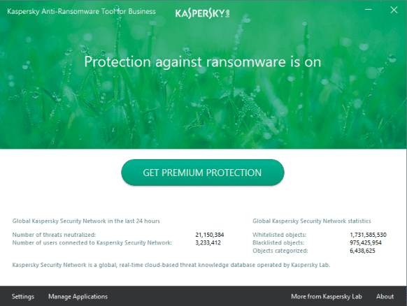Kaspersky Anti-ransomware is terug te vinden in het systeemvak rechts op de startbalk, als zeshoekig icoontje met een vinkje in. Als je het programma opent, kom je op een scherm met algemene info terecht. Je vindt er onder andere globale cijfers over de digitale bedreigingen die het antivirusbedrijf heeft afgewend in de laatste 24 uur en een grote knop die je uitnodigt om te upgraden naar een betaalde versie van Kaspersky’s beveiligingssoftware.