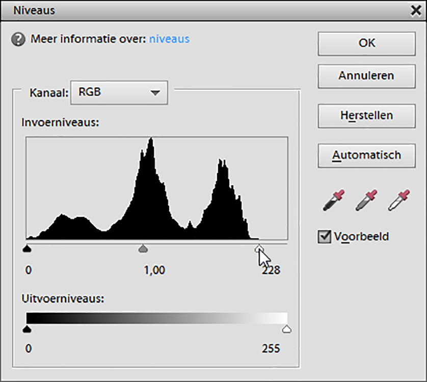 Deze functie, ook te activeren met Ctrl+L, is misschien de meest gebruikte handmatige correctie. Hiermee kunnen we drie toongebieden apart behandelen. Door de blokjes onder het histogram te verschuiven, past je het toonbereik aan. Schuif je het zwarte blokje naar binnen, dan worden donkere gebieden donkerder. Schuif je het witte blokje naar binnen, dan worden lichte gebieden helderder. Nu heeft niet iedere afbeelding een dergelijke behandeling nodig. Als er al sprake is van dichtgelopen gebieden heeft dat niet zo veel zin, maar bij een histogram waar detailinformatie vooral in het midden zit en de afbeelding geen 100% wit en zwart bevat (denk aan het silhouet van een vrijstaande berg) is dit een ideale aanpassing. In dat geval is het gebruikelijk om het zwarte en witte blokje zo dicht mogelijk tegen de uiteinden van de informatieverdeling te plaatsen. Hierdoor wordt de lichtinformatie herverdeeld over de volledige bandbreedte, zonder risico op bijknippen.
