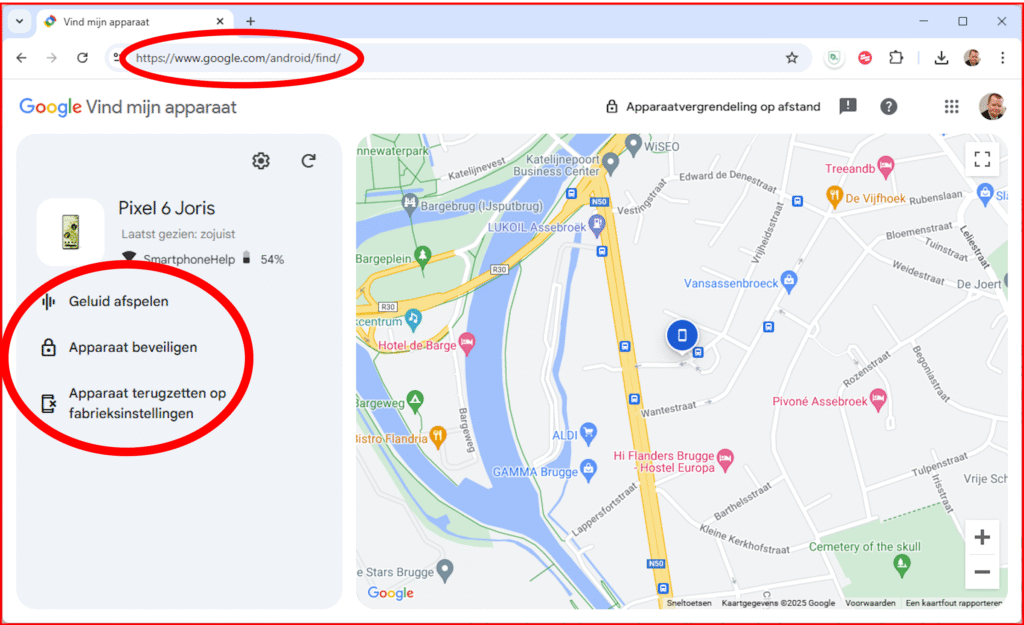 Je merkt nu dat het via je computer mogelijk wordt de positie van je toestel terug te vinden, zodat je bijvoorbeeld kan nagaan of het niet gestolen werd. Je kan ook op ‘Geluid afspelen’ klikken om een geluidssignaal op je telefoon af te spelen, zodat je hem kan terugvinden op het gehoor. Met ‘Apparaat beveiligen’ kan je op afstand een nieuw wachtwoord voor de schermvergrendeling instellen. Met ‘Apparaat wissen’, ten slotte, kan je ervoor zorgen dat je toestel gewist wordt indien het onverhoopt gestolen zou worden, zodat tenminste je persoonlijke gegevens niet in gevaar zijn.