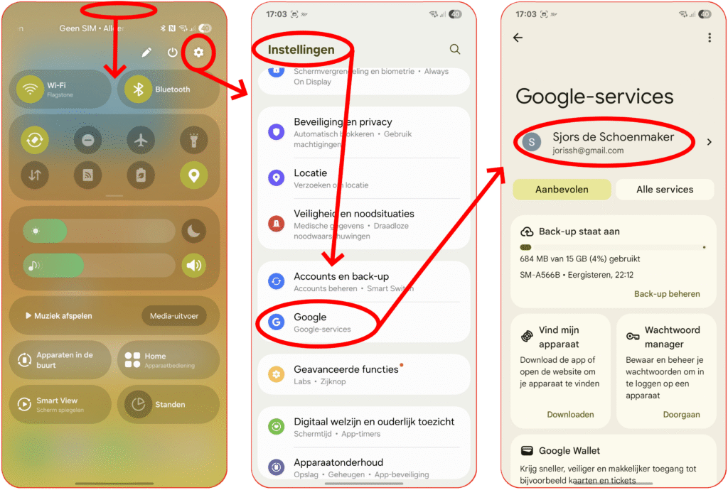 Op je Android-telefoon opent je de app ‘Instellingen’ door de statusbalk naar beneden te trekken en op het tandwiel te tikken. Scrol in de lijst tot je bij het item ‘Google’ komt en tik erop. Gebruik je een Pixel-telefoon van Google? Dan dien je geheel bovenaan in de Instellingen op je naam te tikken. Normaal gesproken zie je daar dan bovenaan je Gmail-adres staan en kan je ook hier na tikken op je naam doorgaan naar ‘Je Google-account beheren’. Indien niet, dan heb je nog geen Gmail toegevoegd en kan je dat nu doen door op ‘Account toevoegen’ te tikken.