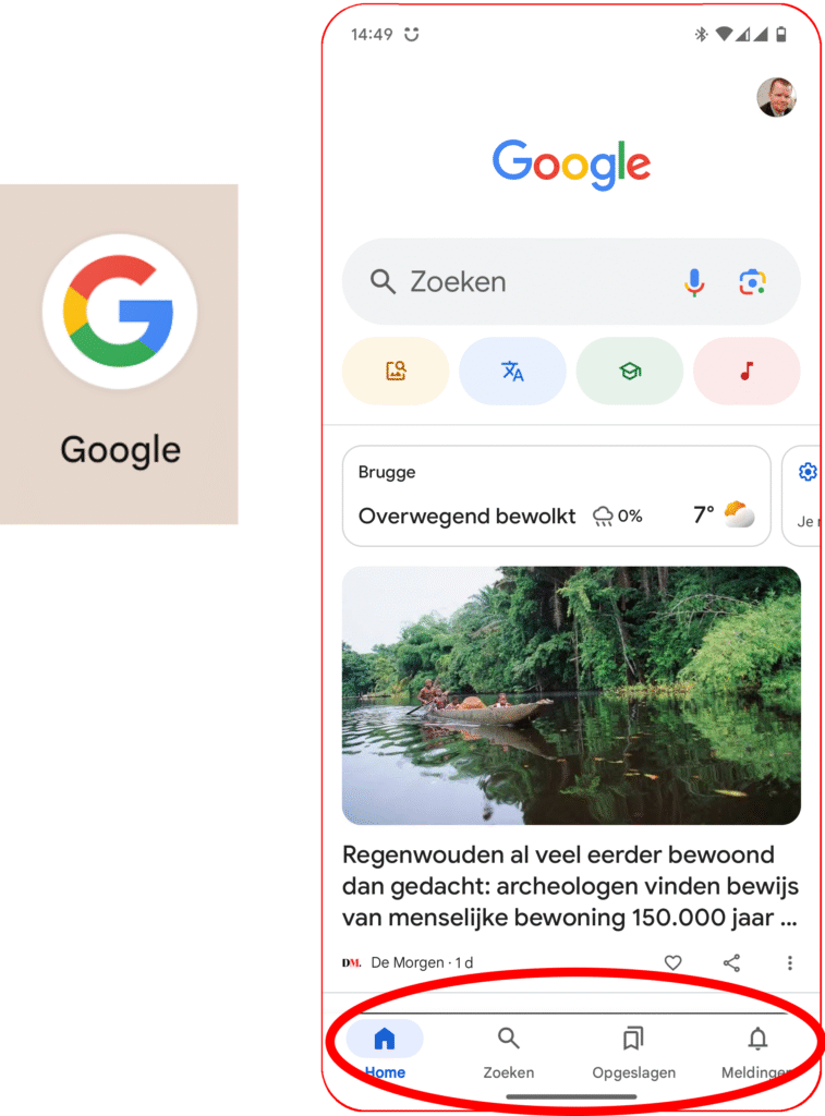 Na het tikken op de grote G ziet je onder in het scherm van de Google-app dat er tabbladen met een aantal knoppen staan. Aan de blauwe kleur kan je zien in welk onderdeel je zich op dat moment bevindt. Dit zijn achtereenvolgens: