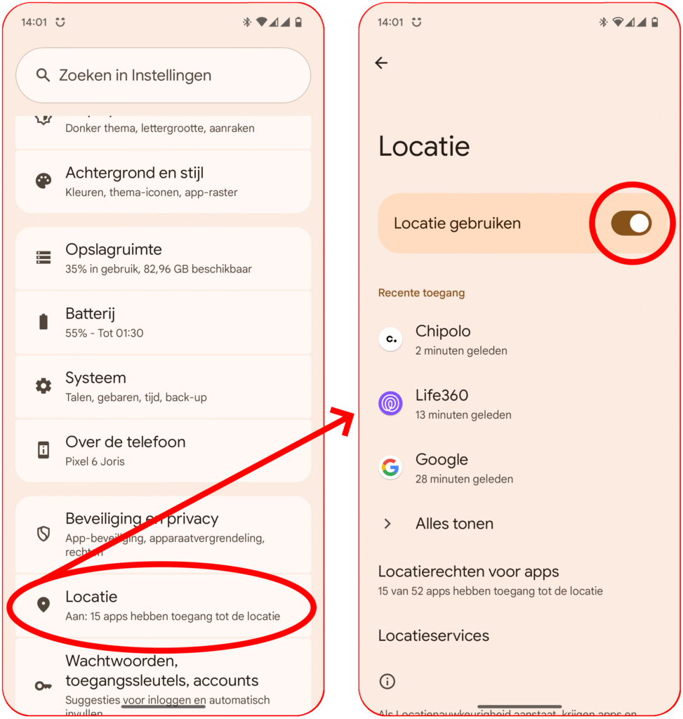 Zorg dat Locatie op AAN staat. Je ziet hier ook welke apps onlangs van je locatie gebruik hebben gemaakt.