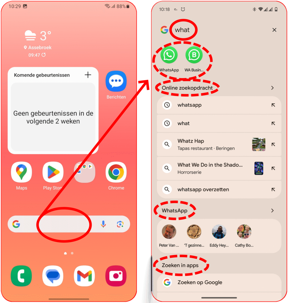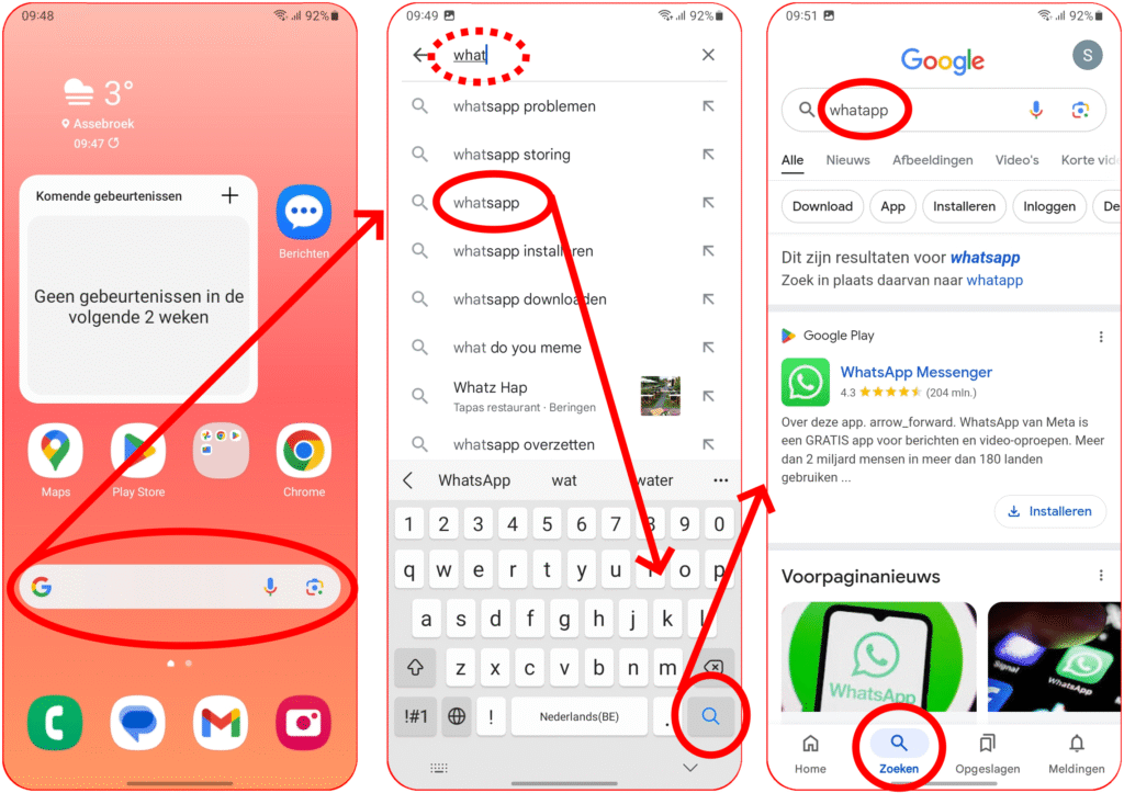 In het middelste scherm is het woord ‘what’ ingevoerd in het zoekvak. Het rechterscherm toont het resultaat na het zoeken op het woord ‘whatsapp’ in Google.