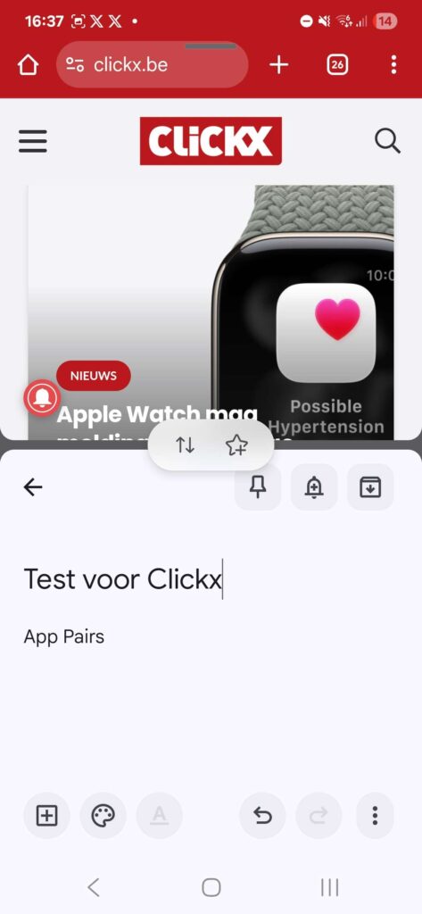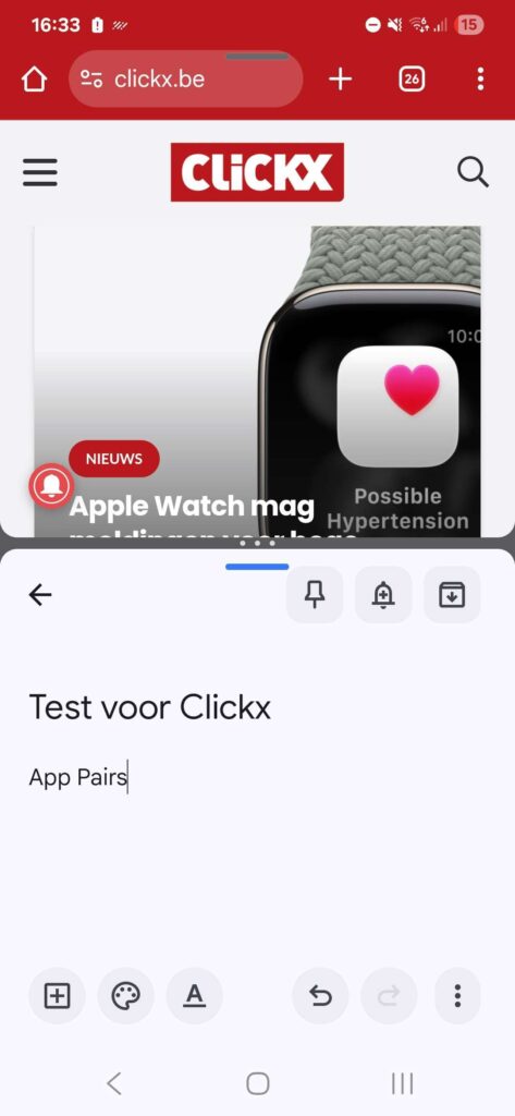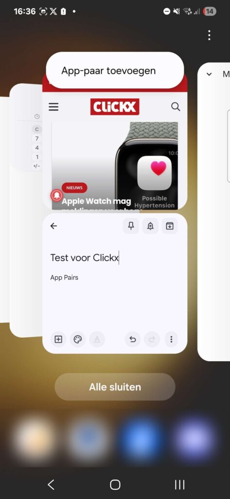 Als beide apps open staan, roep je opnieuw het overzicht van geopende apps op. Hier zie je dat de icoontjes van beide apps al aan elkaar gekoppeld zijn. Afhankelijk van je toestel, zie je ook al meteen een knop beschikbaar om een App Pair (App-paar) te creëren. Het zou kunnen dat je op de icoontjes moet klikken alvorens je die optie krijgt. Klik je op de knop, dan wordt een App Pair aangemaakt dat je kan bewaren op een plaats die je telefoon toelaat.