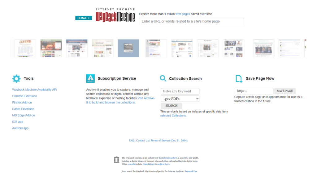 Op de homepagina van de Wayback Machine kan je gewoon een link invoeren om alle gearchiveerde snapshots voor die website te zien te krijgen.