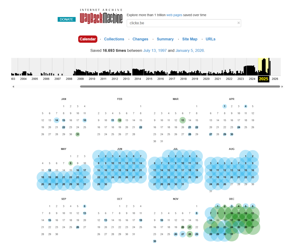 Je krijgt per link een kalender te zien met de jaren en specifieke data waarop er snapshots zijn gemaakt.